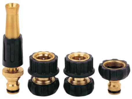 Set of brass fittings with rubber coating to 1/2 " Includes: 1 nozzle, 1 female-male "click" quick connection, 1 male "click" quick connect male with "stop", 1 tap adapter with "click" male connector. These products can be sold separately