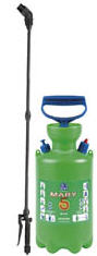 Pulverizador com bomba de pressão para transporte em bandoleira. Inclui válvula de segurança e lança. Capacidade de 5 litros
